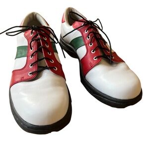 Womens size 9 Narrow, red, white and green, spikes, lace up, low top, custom made, golf, performance, athletic.
