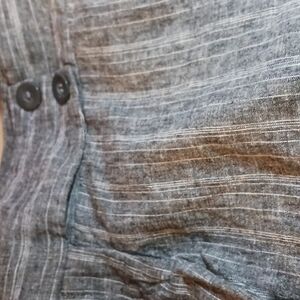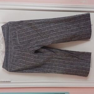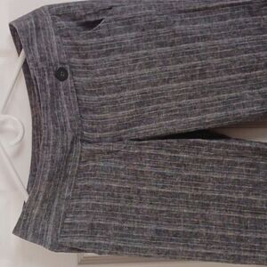 gray with small white pinstripes 3" waistband with button enclosure, front pockets, 54% Linen, 43% cotton, 3% spandex. Inseam 21", flat measure at hem 10", waist flat measure 16"