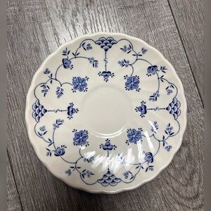 The saucer features the beautiful Finlandia pattern by Myott and the piece was crafted by Staffordshire Ware of England. The expected maker's mark is on the bottom to ensure its authenticity.