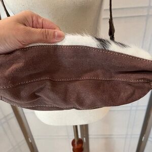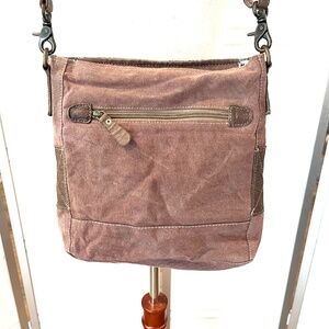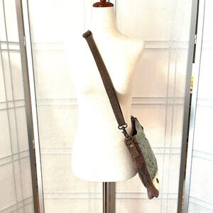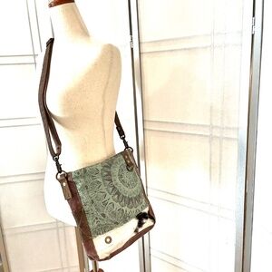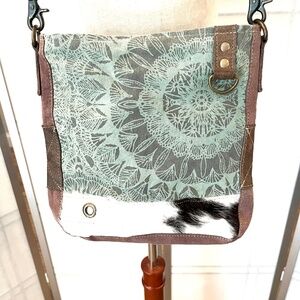 MYRA cowhide canvas teal crossbody bag. Good used condition with some discoloration on the strap and use on the bottom right front of the bag.