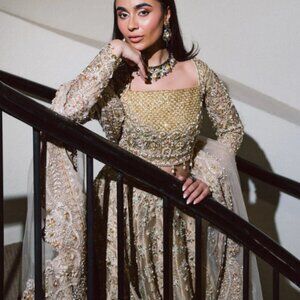 This exquisitely created all-gold ensemble, which includes a net dupatta and choli, is made from opulent tissue fabric. The ensemble is lavishly embellished with elaborate details that make a dramatic impression with each movement. The combination of tissue fabric shimmer and delicate net detailing provides layers of texture and depth, raising this design to the level of exquisite elegance. This piece embodies elegance, workmanship, and glamour, making it ideal for lavish Eid festivities or nighttime events.