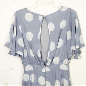 Mystic lavender & white spotted romper, zips at the back with keyhole closure, with front pockets, fully lined with wide flutter sleeves.