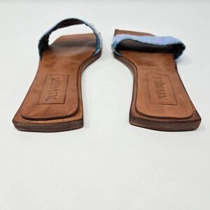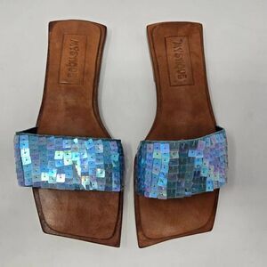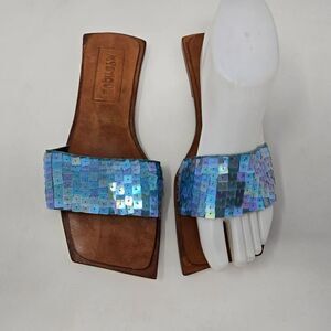 MYSTIQUE BLUE SEQUIN SHINY TOOLED BROWN LEATHER SLIDE SANDALS WOMENS SIZE 6