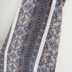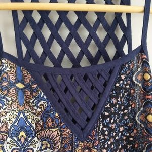 Boho Latice detail maxi print dress. Flowy, side slit and fishnet back. Fabric 100% Rayon. True to size.