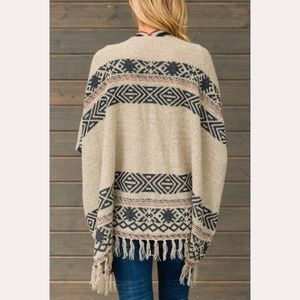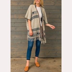 Beige knit kimono cardigan with elbow-length sleeves, tribal pattern in black and rust and fringe along the bottom hem.