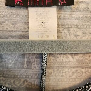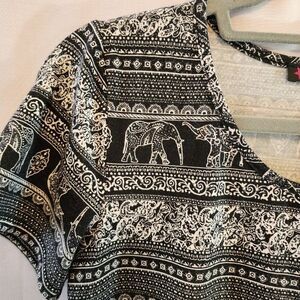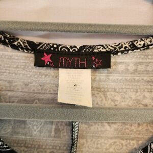 NAME: MYTH SAFARI PRINT TOP, DRAMATIC CROCHET HEMLINE, SIZE LARGE, BLACK/WHITE, HEMLINE IS HI/LOW. SEE MEASUREMENTS FOR FRONT AND BACK LENGTHS. 6 INCHES LONGER IN BACK. TRUE TO SIZE.
