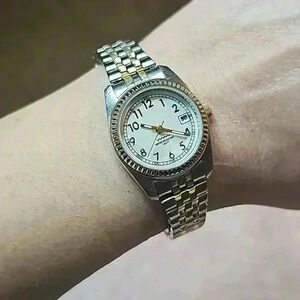 This is a round face watch with a striated bezel in gold and silver tones with a stretch metal bracelet in a classic pattern. The face is a soft silver tone and features a date window. The watch is by M.Z. Berger, has a stainless steel back, Japanese movement, and is water resistant to 100 ft.
