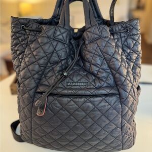 SUPER LEIGHT WEIGHT BLACK QUILTED BACK PACK BY MZ WALLACE. ACCENTED IN BLACK HARDWARE, METAL LOGO ON FRONT OF BAG. DRAWSTRING AND ZIP TOP CLOSURE. FRONT ZIP POCKET, TWO SIDE SLIP POCKETS AND BACK ZIP POCKET WITH BLACK LEATHER PULLS. MZ WALLACE LEATHER LOGO ON BOTTOM OF BAG. DUAL HANDLES. ADJUSTABLE BACKSTRAPS.