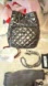 Elegant quilted design. Features chain and fabric strap. Stylish and versatile.