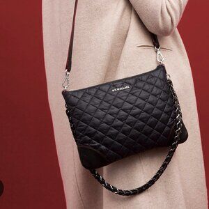 "LIKE NEW" Gorgeous Looking Black Quilted Crossbody By MZ Wallace. Quilted Nylon & Lambskin Leather, Black with Red Contrast Trim/Accent, Zip Top Closure, Metal Branding/Logo at Front, Silver-tone Logo Hardware, Removable Black Nylon Zip Pouch, Pouch Measures 6 X 8, & Includes 3 Removable/ Change Out Straps: 1) Chain & Leather, 1) Adjustable Leather, 1) Adjustable Wide Nylon, Bag Measures approx. 8" T X 11" W, Like New Condition, No Wearing/Corners / Stains, Includes Large Dust Bag:) Rt.395.00 approx. * This Bag was Never Used, Purchased & Stored & Can Carry All the Essentials.