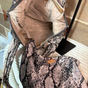 Soft and silky MZ Wallace bag has leather trim, 1 interior zipper pocket and 3 slip pockets plus a matching pouch. Fun snakeskin print, this bag measures 10.5" x 9" x 5.5". Good, clean condition.