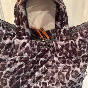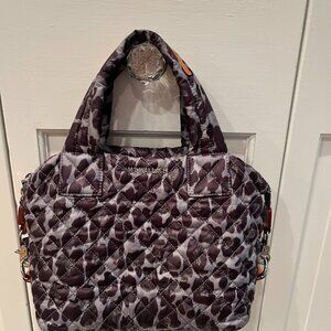 MZ Wallace Shoulder Bag, Grey Nylon with Animal Print, Quilted Pattern & Signature Logo, Silver-Tone Hardware, Natural Leather Trim