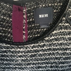 Anthropologie (Maeve brand) mixed media dress with textured tweed/sweater-like effect in front, loose and flowy on the back. Dress has slimming effect with black fabric panels on arms and has leather-like accents around collar and pockets. 3/4 length sleeves and buttons up on top half of back of dress. Above the knee length.