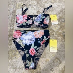 Maaji for Anthropologie Sustainable Night Jungle Irene Reversible Bandeau Bikini set. Both pieces are new with tags and size small. Beautiful high waist fit bottoms. Adjustable straps on top.