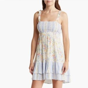 Mixed floral prints bring charming style to a lightweight cover-up dress fashioned with ruffled straps, front ties and a flirty cutout.