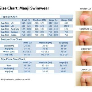 Maaji bikini bottom with the signature cut that's reversible. I love Maaji because since they are reversible you're getting two adorable swim suits! I've included a size chart so you can double check your sizing. Sidenote: Maaji does tend to to run small.