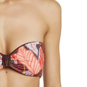 A versatile bandeau bikini top features reversible prints along with removable sleeves, removable straps, and removable soft cups for multiple styling options. Sweetheart neck. Removable soft cups. Removable adjustable straps. Detachable off the shoulder sleeves. Front knot accent. Side boning. Reversible/lined. 85% polyamide, 15% spandex. Hand wash cold. New with tags.