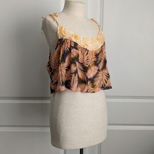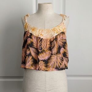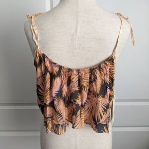 Wear as a crop top or as a cover-up apres swim! Sleeveless. Adjustable self tie spaghetti straps. Scoop neckline. Asymmetrical hem. Palm print with floral print trim. Cropped silhouette. Swing style. Lightweight fabric.