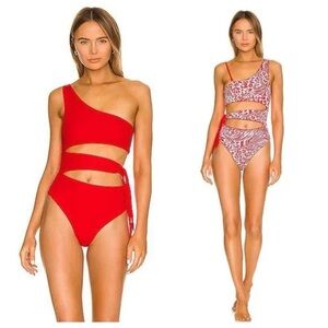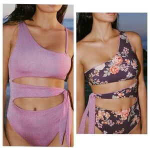 One-piece swimsuit. High waist. One shoulder. Without soft cups. Reversible. Tie at the waist. Cut of the pantyhose with little coverage. Wide sides.