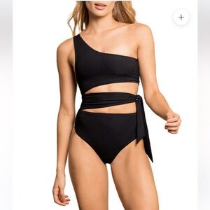 Feel fierce in Maaji Midnight Black Stunning Cut Out One Piece. A fashion statement that gathers multiple ways to wear for different looks, wide straps and fit for better comfort, and a fantastic one-shoulder sleeve design. Details that will make you love this garment. Wear it tied on the side, flip it from the inside out, untie it, and look totally unique.