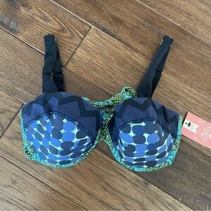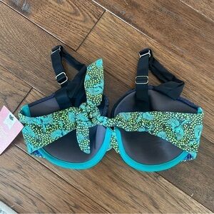 Eye catching balconet bikini top features underwire, thick adjustable shoulder straps, molded cup and ties at back.