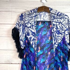 In great condition. Multicolored equestrian horse themed kimono swim cover up. Black fringe detail. Lightweight. Refer to pictures for measurements. From smoke-free/pet-free home.