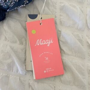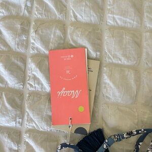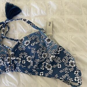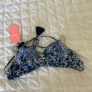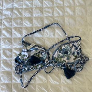Chic navy bikini top with floral accents. Features adjustable straps and tassel embellishments.