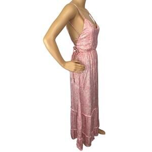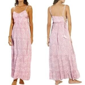 Maaji Nicole Palm Print Lace-Up Maxi Dress Pink Tassel Tiered Size S