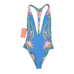 Maaji One Piece Swimsuit Maya Blue Tiki Plunge Reversible Floral Racerback