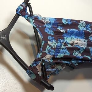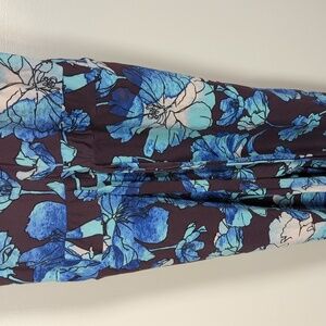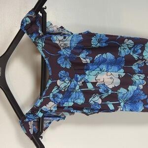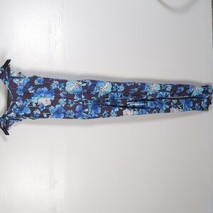 Gray background with blue, green, and white floral print. Sleeveless with flutter detail along the straps. Ties at the waist. Elastic straps. Pull on style. Straight leg silhouette. Excellent condition -- no stains, holes, or fraying. Laid flat pit-to-pit: 15in. Laid flat waist: 13.5in. Shoulder to hem :61in. Inseam: 27.5in.