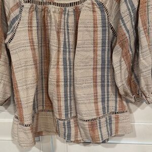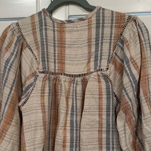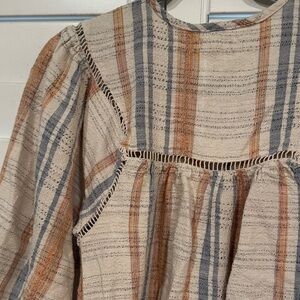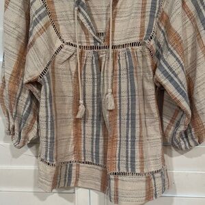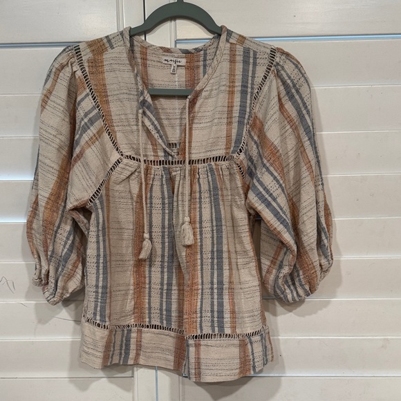 Stylish plaid blouse with beige and blue hues. Features puff sleeves and tassel ties. Perfect for casual outings.