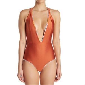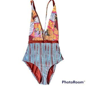 Maaji Copper Multi Reversible Plunge Floral Stripe Lace Up Swimsuit One-piece Bathing Suit S NWOT