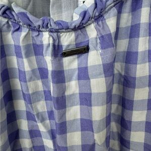 Ladder-stitch insets trace the sides of a breezy cover-up dress patterned in purple-hued gingham checks and finished with tassel-trimmed ties at the shoulders.