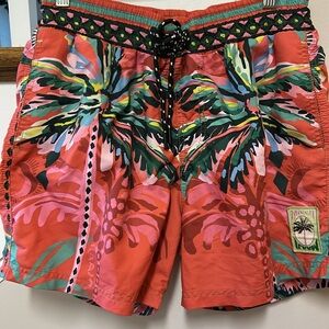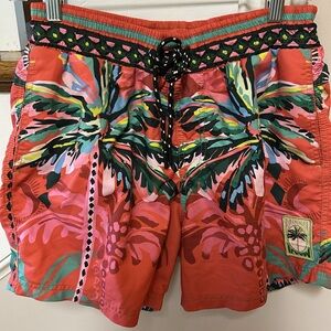 Bold shorts coral with palm leaf design. Interior mesh brief. Comfortable and stylish for active wear. Size small. Elastic waistband and drawstrings.
