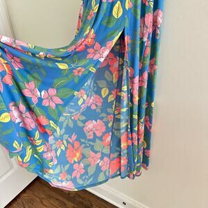 Details: Maaji Star Flower Zandra Sleeveless Lace Back Maxi Dress] - Size: L- Color: Blue- Material: 100% Polyamide- Features: Floral pattern, sleeveless, lace back, maxi length, cut-out, fit and flare style, lace closure, square neck, comfort, breathable, casual.