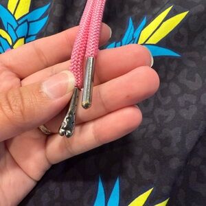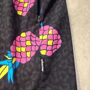 Stylish shorts with a pink base and black waistband. Features a vibrant pattern for a playful touch.