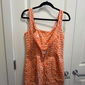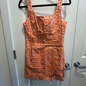 Cotton-blend fabric. Short design. Rounded neck. Wide straps. Straight design. Elastic gathered section. Back slit. Opening in the lower front. Side zip fastening. Available in plain and patterned. Plus Size Available. Party and events collection.