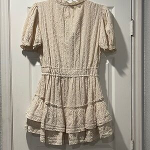 Stylish cream dress with textured fabric. Features short sleeves and ruffled details.