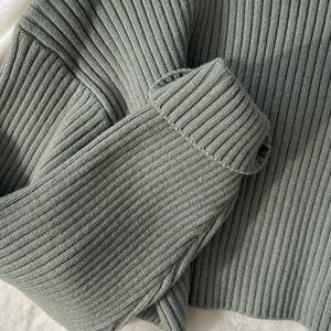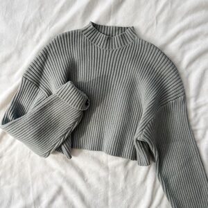 This is the most luxurious-feeling sweater ever. It has a short cropped cut with a high turtleneck and long sleeves. The color is a really pretty sage green, the material is a viscose-polyester-nylon blend that feels like a CLOUD. Never worn, new without tags! True to size.