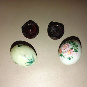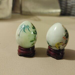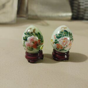 Add a touch of elegance to your home decor with these exquisite hand-painted ceramic eggs. Featuring intricate floral and bird designs, these pieces come with charming wooden stands.