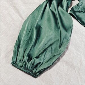 Mable satin green crop top blouse. Features a tie front, off the shoulder smocked balloon sleeves. Smocked back and lightweight soft material.