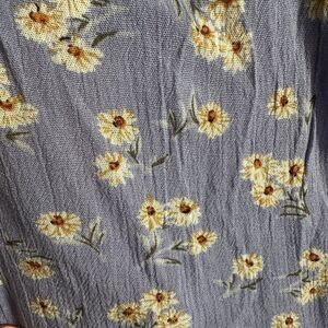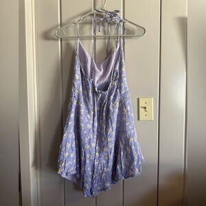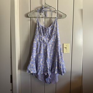 Charming lavender purple romper with floral, daisy pattern. Perfect for a casual outing. Straps can be worn straight or crisscrossed and are adjustable. Super cute for spring and summer. Has a zipper in the back.