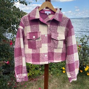 Mable Micah Brushed Fuzzy Textured Pink Plaid Crop Button Down Jacket size Small