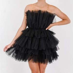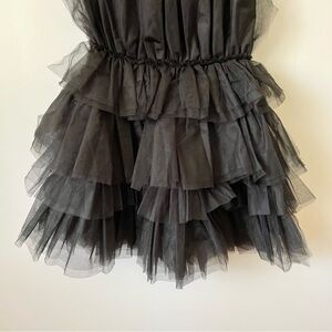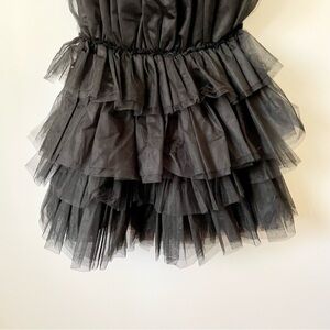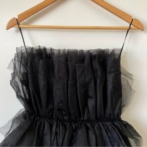 Mable Organza Tube Ruffle Mini Dress Black Women's Size S. This dress is in excellent condition with no stains or tears. Channel your inner supermodel and make a statement in this dress! This dress features tulle layering and a ruffle tulle detail at the neckline. Perfect for a fun night out or for an upcoming event!