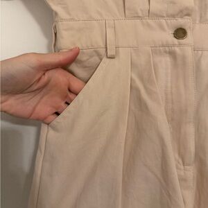 Stylish tan romper with button-up front. Features short sleeves and a collared neckline. Perfect for casual outings.