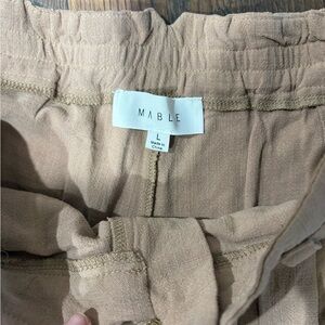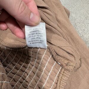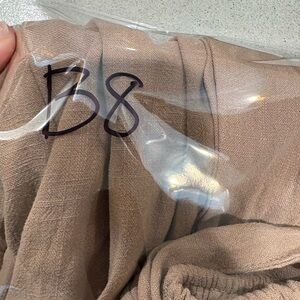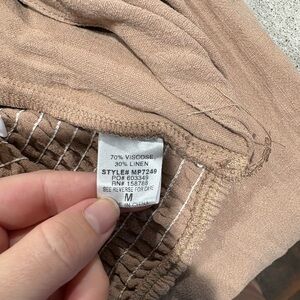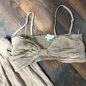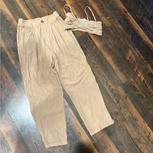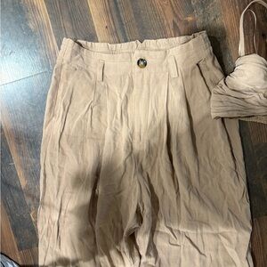 Stylish tan two-piece set with pants and bralette. Perfect for casual outings. Size medium top and large bottoms