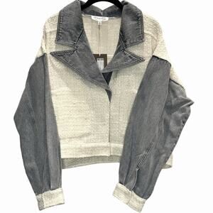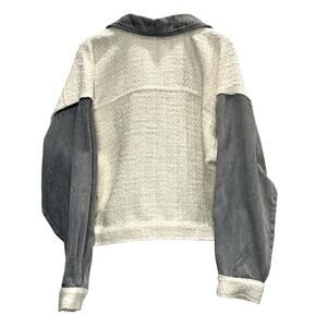 A chic mixed-media jacket combining soft ivory tweed with washed denim sleeves and collar. Features a cropped silhouette, oversized lapel, and subtle raw-edge detailing that merges structure and ease for a modern, elevated casual look.