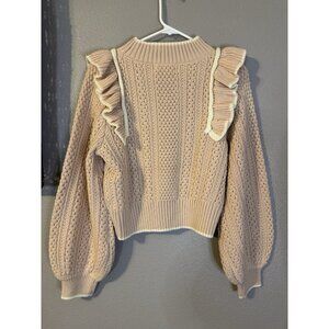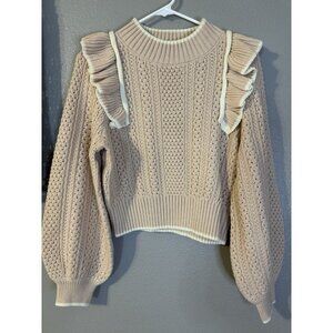 Mable Women's Sweater S Pink Cream Ruffle Trim Cable Knit
