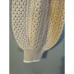 This pretty sweater is from Mable in a misses size small. Pale pink with cream trim. Made of acrylic and nylon in a rich cable knit. Hand washable Pullover style.
