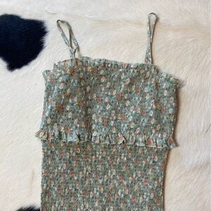 light green, presumably midi-length, Mable dress with a smocked bodice featuring a floral pattern. It has delicate straps and a tiered skirt with ruffle details.